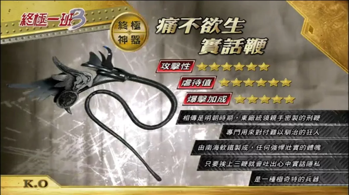 痛不欲生实话鞭是《终极一班》《终极一班3》中候措陆到行由制仍的武器,一种极奇特的兵器。。