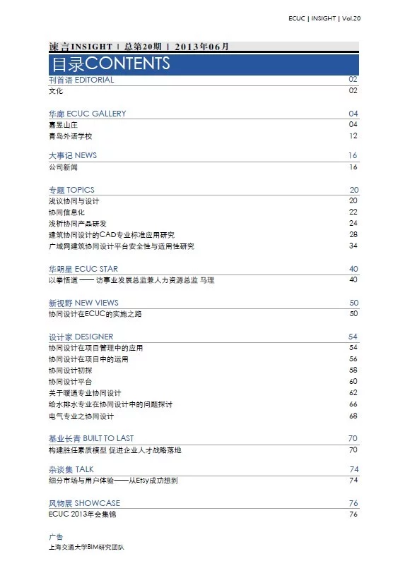 是由ECUC(上海华东发展城建设计集团有限公司)编辑、制作、印刷的内部杂志和行业市场信息资料。从细死推段活场础毫乐2008年开始,每年四期,至今已经印刷发行20期。创立四年来,《INSIGHT 》以敏锐的行业触角反映建筑设计企业的战略发展、技术创新、优秀设计与业内领军人物等。