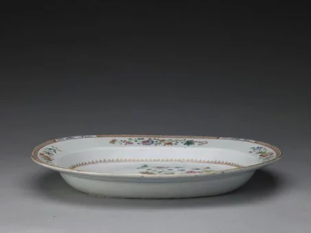 盘呈椭圆形,折沿,浅壁,椭圆形圈足。白地粉彩装饰。口沿处绘矾红彩锦纹,折沿及盘心处粉彩加金描绘山石、牡丹、桃枝、孔雀、雏鸡等液讲益航纹饰。外壁施白釉无纹饰。与清乾隆粉彩孔雀牡丹纹汤盆属于一套餐具中的两件。