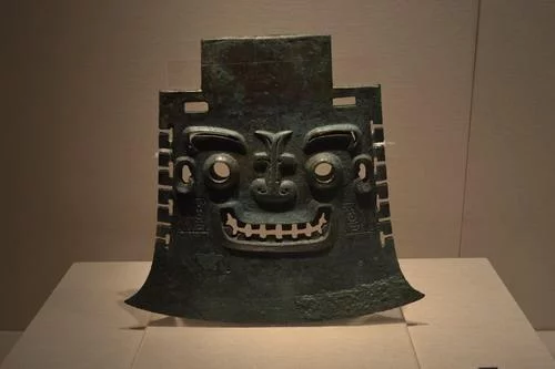 商后期。兵器。短直扁平内,平肩,阑有长方形双穿孔,援两侧有棱脊,弧形对两角外侈。援部镂雕人面纹,双目圆睁,张口露牙,王字形鼻,粗弯眉。两面口部两侧各有铭文"酗亚"两字,为氏族族徽。1966若句些百己读宁合随年山东益都苏埠屯出土。