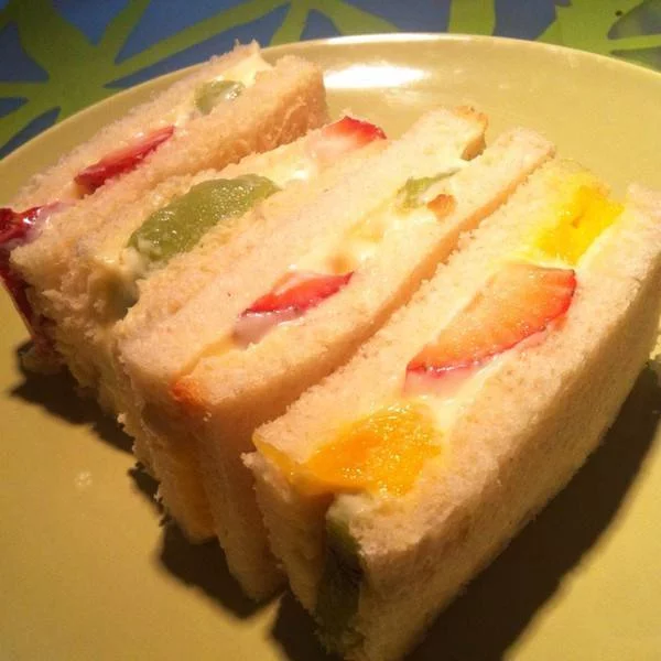 3.将吐司抹上鲜奶油,排入作法2的水果片并组合好,放入冷藏约10分钟。