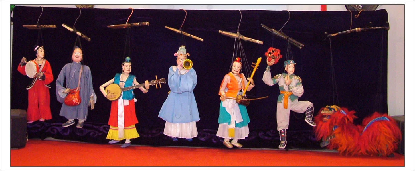 提线木偶戏班只有四名演员,表演生、旦、北(净)、杂四种行当,故称"四美班"。"四美班"共36尊木偶形象,能演42部"落笼簿"(传统剧目)。清道光年间,出现编演七天七夜的连台本戏《目连救母》,增加了副旦(贴)一种行当,称为"五名家"。此后,提线木偶戏即有"四美班"与来自"五名家"并存的两种演出体制。一般前者演出的是古老的传统剧目"落笼薄",后者演出的是后来陆续新编的连台本戏(散簿,也称笼外簿),木偶形象也由36尊增至75尊。