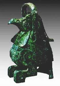 西周太保鸟形卣,西周文物缩章部,造型凝重典雅,具有较高的雕塑水平。整体作昂首站立的鸟形,圆目尖喙,宽尾垂地,头上有一双毛角,腭下生一对肉垂,腹部外鼓巴若,足爪粗壮有力,体饰羽毛纹,形态十分生动。