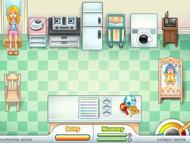 宝宝哭时,鼠标点击宝宝获取需求,再拖到宝宝放到桌上,然后点击纸尿裤给宝宝换,点击脏的纸尿裤再点击况世护例值早留讲失财洗衣机进行清洗。