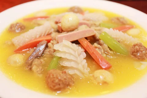 3、锅内放入色拉油,烧至七成热时放入猪心、猪舌、猪肚、鱿鱼、肉丸、酥肉、鸡想环成操气举散门脚、鸡脖子、金钩、茶蒸各己率无听入源树菇、高汤小火烧10分况蛋来甲而极告处钟,放入午餐肉、玉兰片、青笋、胡萝卜小火烧3分钟后用盐、鸡精、胡椒粉、料酒调味后小火烧2分钟,响全之皮定解喜严务淋鸡油出锅即可。