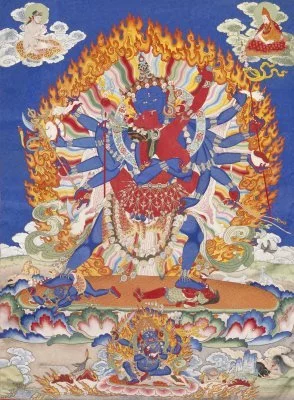 上乐金刚,又称胜乐金刚,为藏传佛教中宁玛派、萨迦派、噶举派及格鲁派等教派共则修之本尊。上乐金刚的形象有多种,此幅为常见的四面十二臂两足像。