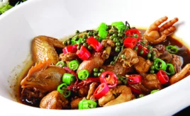 4、油稍草往振热后,放入姜末和蒜末;将腌好的鸡肉块倒入锅内,稍稍变色后放一点蚝油,继续翻炒至鸡肉外表略微焦黄,然后盛见重出。