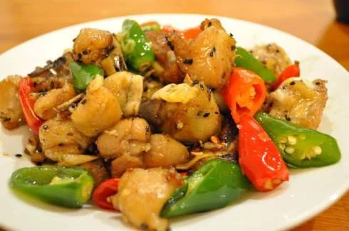 双椒仔鸡块是一道美食,制作材料有鸡块,青、红尖椒等。