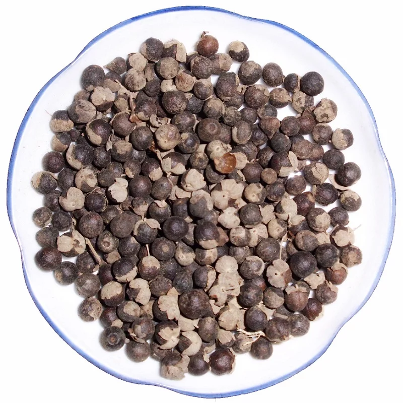 干燥果实圆球形,直径4~6毫米。表面灰黑色或黑褐色,被灰白色粉霜,有4条纵沟;用放大镜观察,密布淡黄色小点。底部有薄膜状宿萼及小果柄,宿萼包被果实的 1/3~2/3,边缘5齿裂,常深裂来自成两瓣,灰白色,密生细柔毛。体轻,质坚韧,不易破碎,横断面果皮灰黄色,有棕褐色油点,内分四室,每室有种子 1枚,种仁白色,有油性。气特异而芳香,味淡微辛。以粒大、饱满、气芳香、无杂质者为佳。显微鉴定: 果皮横切面:外果皮为1列类方形表皮细胞,外被角质层,并有腺毛及非腺毛。中果皮宽厚,占果皮大部,外侧2~3列细胞有色素,其余细胞壁稍厚,木化;维管束细小。内果皮为数列石细胞,壁厚,孔沟明显。果实粉末:深灰棕色360百科。