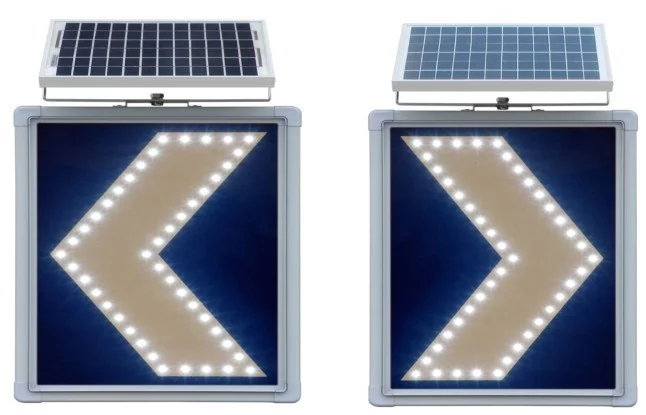追逐式太阳能导流牌是将每一个太阳能标牌里的太阳能板、电池、控制电路集中起来,集中到一个主控制太阳能标牌内,各个太阳能标牌通过导线与控制连接。一个控制系统有效控制距离可以为500米。太阳能标牌仅保留led和一个简单的稳压电路,电池、太阳能板均可以更换,优点是太阳能板是唯一的,非常适应在山区曲折、树木茂盛、地面阳光不充沛的道路上安装太阳能标牌。只需将一块太阳能板放在阳光充沛的地方即可。缺点是安置连接导线较为麻烦,导线如果受到破坏或盗窃,整个系统会无法工作。
