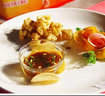 (2)鸡腿肉沾匀蛋青糊,油锅烧开,将鸡球排进油锅,炸至成熟至表面金360百科黄酥脆时捞起沥油摆盘。
