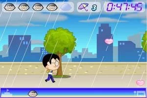 在规定时间内收集爱心和雨伞,躲避大水滴跟水洼,把伞送到来自大头妹手上。