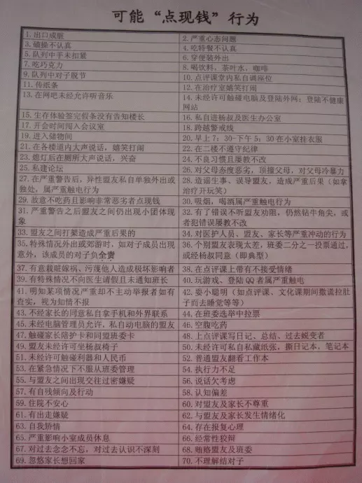 "点现钱"是一种该中心独创的"电击疗法",而"可能点现钱"的规定多达86条,比如,"吃巧克力""空来自腹吃药""盟友未经许可坐杨叔椅子"和"上厕所锁门"等等。违反86条中的任何一条,都要接受电疗。