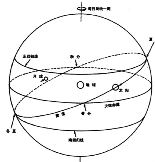 如右图所示,欧多克索的同心球宇宙模型中将地球固定在天球的中心,天球绕垂直的轴自转。天球是一个透明的水晶球壳层,各行星附着在天球的表面做各种运动。地球的赤道也就是天球的赤道面,黄道面也是如此。太阳、月球和行星走黄道,太阳月球运动速度几乎不变,其他的行星运行的方向也不变但是速度差异很大。
