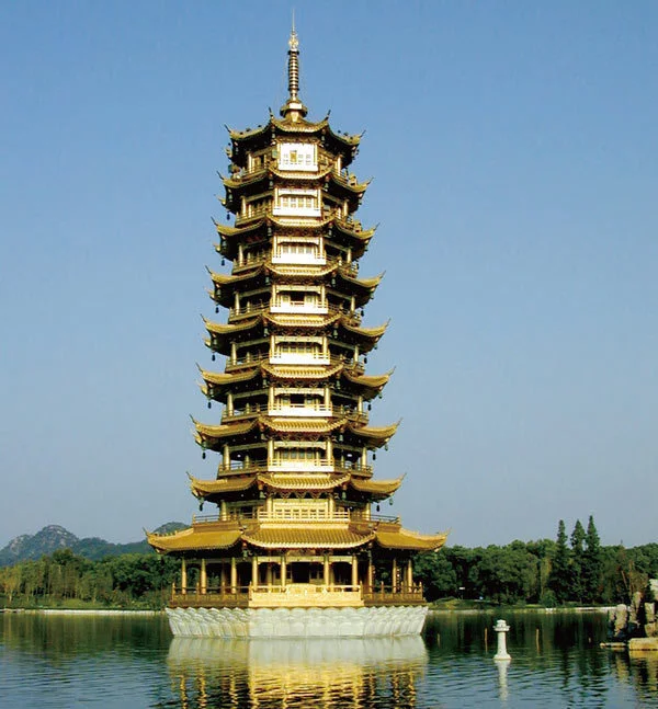 桂林铜塔是一座高达47米的全铜塔。它巍然屹立于桂林市区内的开放型自然人文景区杉湖水之中,似擎天的利剑般直指苍穹。