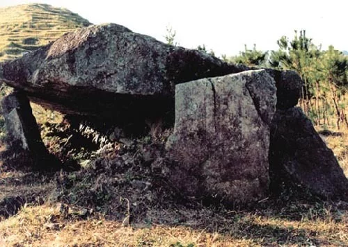 韩国支石(石棚)墓:石棚墓分为两种,一为桌式石棚,即在地面竖3至4块壁石,上面盖一块大石构成;另为棋盘式石棚,即在大石板下面支以4至8根支撑石构成墓室。