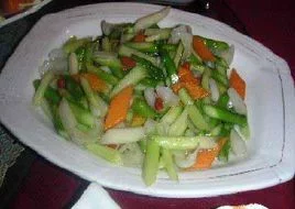1、各来自类菜,洗净、改刀成片或段,用些盐开水焯烫,控出、冷却;