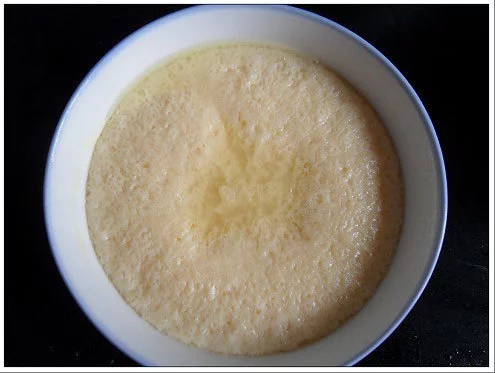 3、已经蒸好的胡萝卜汁鸡蛋,这次可能时间把撑不好,蛋看起来没有以前蒸的嫩,不过味道还是不错的,加了胡萝卜汁一起蒸的蛋,胡萝卜的味道淡了很多。