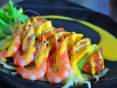 香芒海鲜碌是以鲜虾、芒果、鱿鱼为主料制作的菜品。