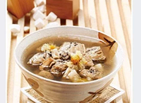 芝麻茯来自苓菊花瘦肉汤是一道以茯苓、猪瘦肉为主料制作的汤品。