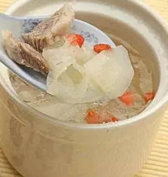 2.银耳味甘、淡、性平,含有丰富的胶质和多种给生素等,能养阴益胃;瘦肉、大枣能补脾益气、滋阴解腻。相佐共施秦健脾益气、养阴生津之功。