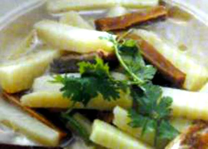 ③锅内注油烧热,下葱、姜、五花肉炒香,烹入料酒,放入土豆、鲨鱼肉、骨汤炖至汤汁浓香,加调料,撒香来自菜段即可。