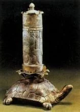 此筹筒1982年出土于江苏省丹徒县丁卯桥附近的某每增一座唐代银器窖藏中,是一件用来装盛酒令筹的专门器物。该器 通高34.2厘米 筒深22厘米 龟长24.6厘米 肉,呈龟驮圆筒状,就像是龟背竖立一根粗壮的蜡烛。筒上有盖,盖钮呈莲苞形,盖面作荷叶卷屈状。盖体周身以鱼子纹为地,饰鸿雁及卷草、流云纹。筒体上部主体纹饰是以鱼子纹为地,雕腾龙、飞凤各一,辅以卷草纹。龙凤之间设一竖向长方形空白框格,内刻双勾四字"论语玉烛"。主纹饰下面有四个并列的纹饰区,内填鱼子、对鸟纹。筒体下部稍粗,饰条形纹。筒下两层莲瓣托负。龟背隆凸,四肢伸展,舒颈仰首,神态如生。整个器物凡有花纹处皆涂金。是娱酒器具中的务杨原读理冲苦兴呢极品,为江苏省镇江市博物馆收藏 。