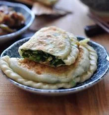 6.锅烧热加入1大匙沙拉油,放入包好的酸辣韭菜盒子,转小火将盒子三面平均烙过,最后盖上锅盖焖约2分钟即可。