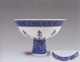 器混背形撇口,弧腹,下承以中空高足若把状。碗状规整,胎薄质坚。青花发标色浓艳。