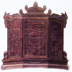 即带来自“八”字形底座的屏风,多由单数组成,最少三扇,最多九扇。通常正中一扇较高,其余依次向两边递减。每扇屏风之间用走马销衔接,下边框装有插棍,插入底座的孔中。边有站牙,屏心多为木雕或漆地嵌石、嵌玉,或彩漆、雕漆等多种形式。屏风顶上有雕花屏帽,既增加了屏风的美感,更加强了屏风的坚固性。