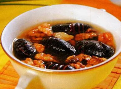 材料:核桃仁100克、蚕蛹50克、生姜1~2片。