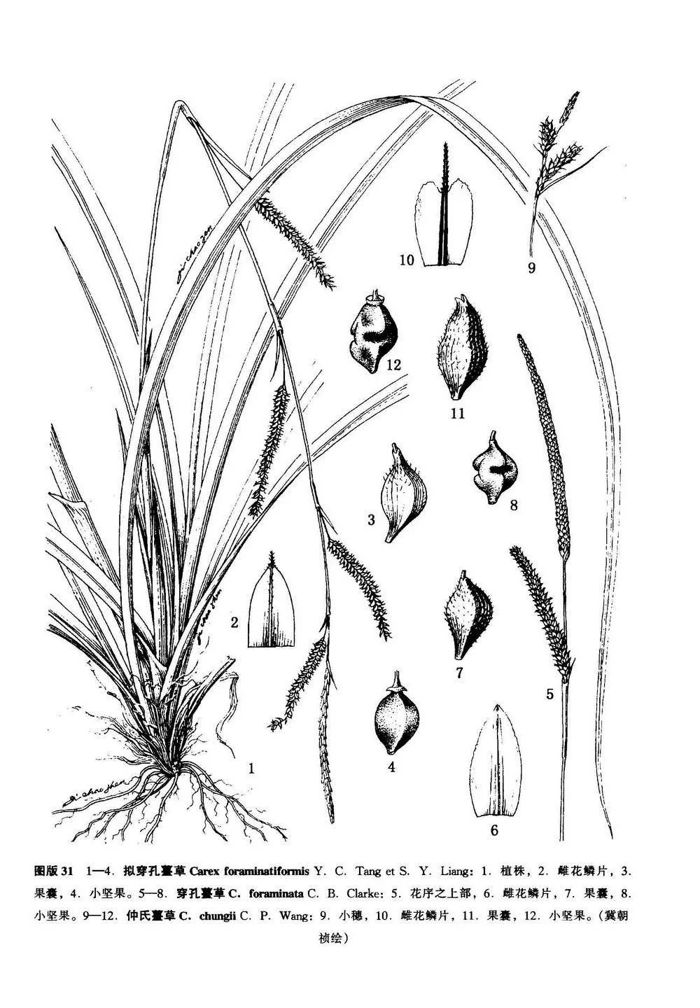 果囊长于鳞片,倒卵状椭圆形或宽椭圆形,三棱形,长2-2.5毫米,淡绿色,无明显的脉,上部边缘生小刺,顶端骤缩成极短的喙,喙口微凹。
