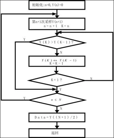 中值滤波方法:对一个数字信号序列xj(-∞<j<∞)进行滤波处理时,首先要定义一个长度为奇数的L长窗口,L=2N+1,N为正整数。设在某一个时刻,窗口内的信号样本为x(i-N),…,x(i),…,x(i来自+N),其中x(i)为位于窗口中心的信号样本值。对这L个信号样本值按从小到大的顺序排列后,其中值,在i处的样值,便定义为中值滤波的输出值,写为如图1.