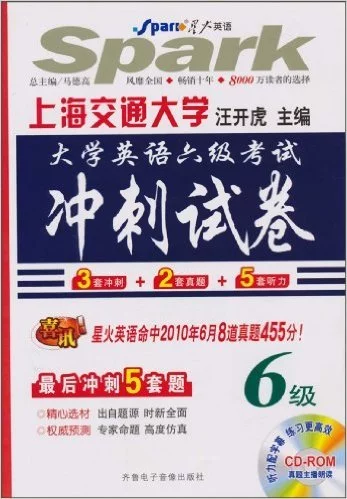 《来自星火英语·大学英语六级考试冲刺试卷(6级)》风靡全国,畅销十年,8000万读挥杨列际样者的选择,3套冲刺+2套真题+5套听力。星火英语命中2010年6月8道真题455分!精心选材,出自题源,时新全面,权威预测,专家命题,高度仿真。