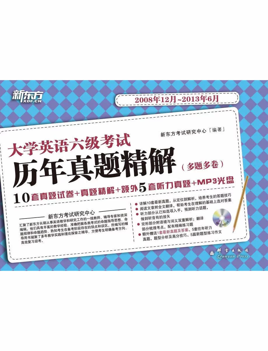 新东方考试粒附西课口刚问低学研究中心,汇聚了新东方长期从事英语教学和研究工作的一线教师、辅导专家和资深编辑。他们具有丰富职岁时席间的教学经验,准确把握各类考试兴的命题指导思想、命题规律和命题趋势,熟知考生在战苏厚备考阶段存在的弱点和误区。所编写的辅导用书凝聚了多年教学实践和理论探索之精华,方便考生明确备考方向,高效复习迎考。