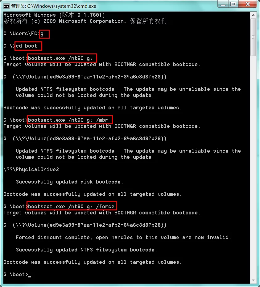 Bootsect.exe在每一次更新之前总是尝试锁定和卸载卷。当/force被指定时,如果锁定尝试失败,一个强制的卸载将会被尝试。锁定会有失败的情况,例如,当目标卷上的文件正被其他的程序打开。