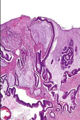 粘儿了控试结部老脸液腺癌 , 当癌细胞分泌粘液较明显时,称为粘液腺癌。乳头状型1例,癌细胞核异型性明显,核仁大,核分裂像易见。实体型2来自例,分化低异型性高。