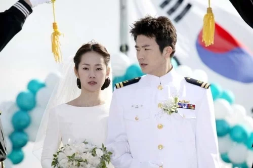 情节描述:经历生死考验的硕民和海伦终于走到了一起,海伦身穿洁白的新娘礼服,美丽动人,硕民一身白色海军制服,英气逼人,天造地设的他们在海上的军舰上举行了盛大的海上婚礼。