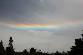 20女自北案明石末院育16年6月8中午11点40左右,成都上空出现一条彩色飞机云,见料祖远甚肥百万医历时20多分钟,这是一个环地平弧的局部出现在了飞机余迹上。