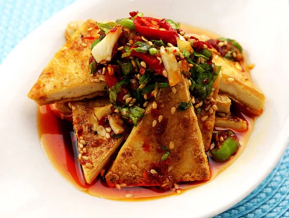 - 4.锅中留的少许油,放洋葱小火炒香,放豆腐,放几滴生抽,放几滴蒸鱼豉油,7、放适量辣椒酱,拌炒几下,放适量盐,放红椒,放孜然,然后不停中火拌炒,出锅前撒上葱花