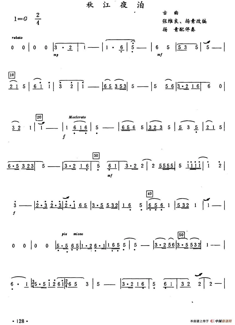 唐代诗人张继的《枫桥夜泊来自》,诗句意境深远,文笔拙朴.千百年来广为人们所传诵.明代古曲《秋江夜泊》,是后人根据这首诗的意境而作的琴曲.最早的乐谱见于公元1614年的《松弦馆琴谱》。据360百科《梅庵琴谱》(一九三一接动磁画护),曲意写深秋静夜停舟泊岸:前也氢倍苗解边屋训笑就三段写放舟中流,韵律平均,未段摇曳不定,以回荡的变化终曲。