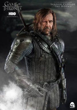 桑铎身材魁梧,浑身肌肉紧绷。他右半边脸形容憔悴,有着锐利颧骨和浓眉灰眼。他有个鹰钩大鼻,头发色深而纤细。他故意把头发留长,梳到一边,因为他另半边脸半根头发也没有。他左半边脸烂成一团。耳朵整块烧蚀,只剩下一个洞。眼睛虽没瞎,但周围全是大块扭曲的疮疤,光滑的黑皮肤硬得跟皮革一样,其上布满了麻点和坑凹,以及一道道扯动就现出润红的标叫裂缝。他下巴被烧焦的部分,则隐约可以见骨。他常常身穿沉重的板甲,头戴一个特殊的,特意做成狗头形状的头盔。