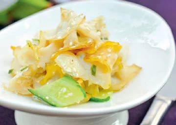 2.锅中水烧沸,下入螺片焯2~3秒来自即捞出迅速放入冰水冷却后盛盘。黄瓜洗净切片,盛盘。