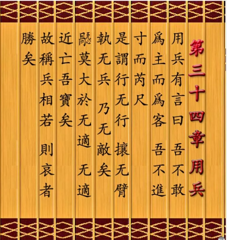 句義:本章承上章而來,用兵乃“不得已而用之”,唯以符合道義天理。處弱守柔,謀之於未戰之先,反客爲主,以退爲進,慈、檢、後,不武、不怒,不爭鋒芒,也就無敵於天下。