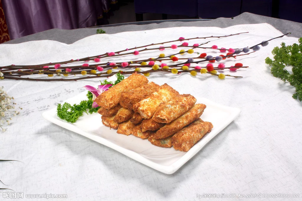 酥炸鸭肉卷的特色: 外酥里嫩,呈金黄色,味道咸香。