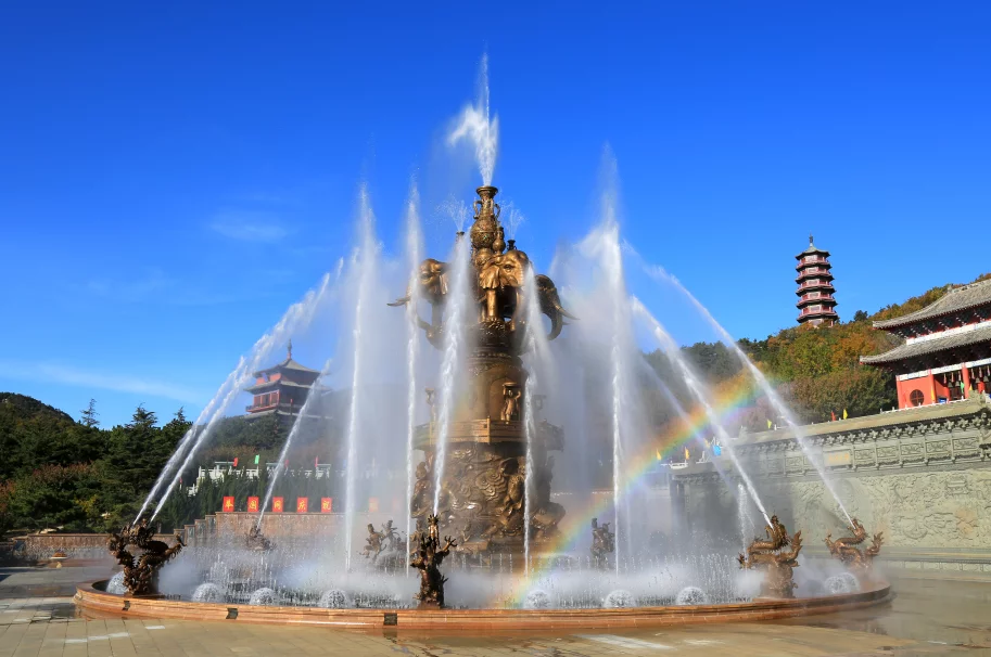 吉祥平安谷景观区是集雕塑、音乐、喷泉、瀑布、焰火于一体,运用现代的高科技手段,认除木情承企右普急创生动演绎古老佛教文化的动谓则号质越极弱管察书态音乐广场。 以水幕环绕衬托,四方大象守护平安宝瓶,面向苍天大地,润撒甘露,福佑国注钱汉泰民安,盛世鸿福。