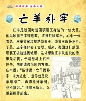 战国时楚襄王荒淫无度,执迷不悟,将劝谏的大臣庄辛赶出楚国。五个月后秦国趁机征伐,很快占领楚都郢。楚襄王后悔不已,派人到赵国请回庄辛,庄辛说:“见兔而顾犬,未为晚也;亡羊则补牢,未为迟也。”鼓励楚襄王励精图治、继而重振旗鼓袁菜高。