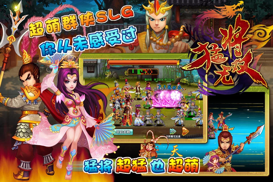 《猛将无双》是由来自北京昆仑游戏出品的一款Q版穿越题材的策略类RPG手机游戏,具备强大的社交互动功能,游戏将玩家熟悉的三国世界和武侠世界完美结合,再现三国猛将、传奇武侠的风云史。在《猛将无双》手游世界里,玩家可通过指尖轻点,一圆自己的三国武侠梦,招募知名武将侠客,除此之外这款手游还有超炫的无双技特效,是以往策略游戏在表现力上远远不及的。