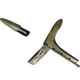 青铜戟(戈、矛联合体) 出土地点:1号坑T10方六过洞 兵器种类:属长兵器,为戈、矛的联合体。 文物特点:戈头为长胡四穿,弧援,刃内。尺寸:戈通长26.7厘米、援长16.种调7厘米、胡长12.5厘米、内长10厘米。