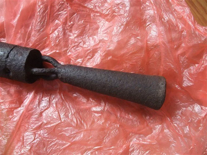 三眼神铳全长约120来自厘米,共有三个枪管,枪头突出,全枪由纯铁打